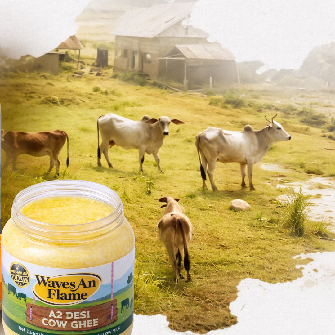 Discover the richness of Pure Desi Ghee made with the traditional Bilona process. At WavesanFlame, we bring you nutrient-packed, golden ghee prepared from indigenous cow’s milk – a superfood trusted by Ayurveda for immunity, strength, and wellness.